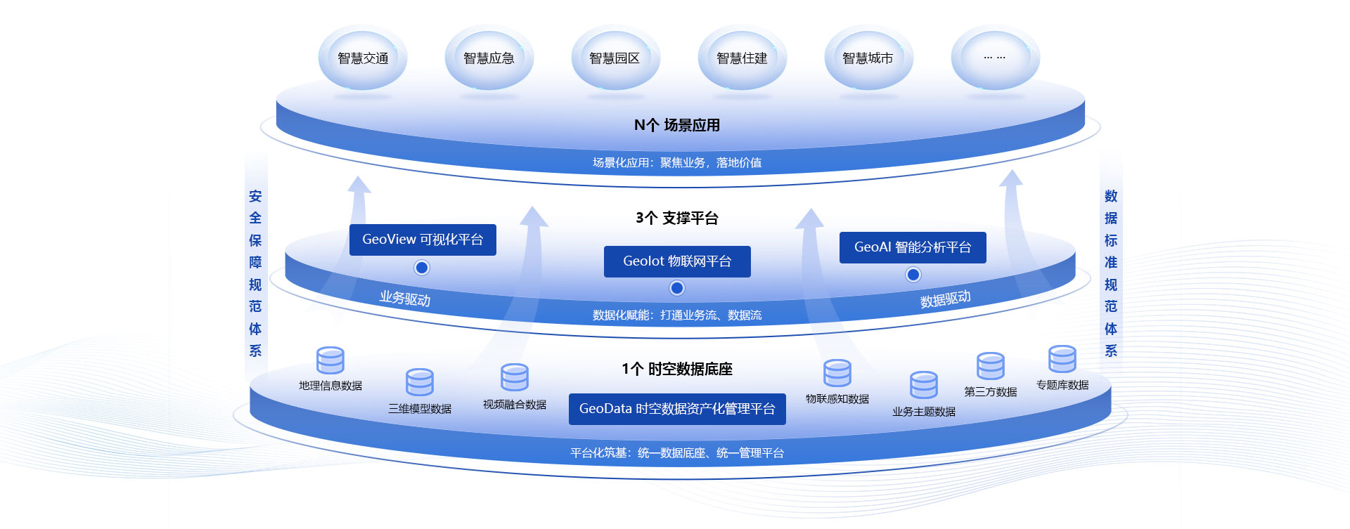 1+3+N架构体系搭建“1+3+N”架构体系,围绕“数·图·智·联”赋能行业数字化转型,提升行业管理全面化、精细化、智能化水平。